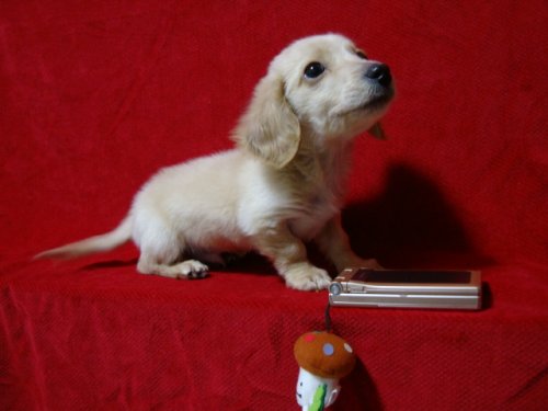 | コメント | ◆生年月日: 2008年10月20日生れ ◆性別: 男の子 ◆毛色: ピュアクリーム ◆血統書: JKC(申請中) ◆現在体重: 950グラム ◆予防接種: ワクチン2回摂取済み ◆両親カラー: 父親:JKCチャンピオン (英国系) Sクリーム 母親:JKCチャンピオン直子 (英国系) クリーム(2.5キロ) ◆性格 性格は明るくおとなしい性格です、人間が大好きで何時もシッポを振って喜んでくれます。 お留守番もちゃんと一人で出来る可愛い仔です、お子様がいる家庭やお歳よりの方にもオススメのワンちゃんです。 毛色ですが、ダックスでは人気カラーのピュアクリームです。 とても上品で美しく優雅で人の目に止まる男の仔です^^ ◆健康状態・予防接種 母親の母乳でしっかり育ち、現在はフードをしっかり食べ便の状態も良く とても元気です。 ワンちゃんは小さいカニンヘンサイズながらも、元気で健康にスクスクと順調に成長しております、健康状態と診断されていますので、いつでもお渡しできます。 噛み合せ・ヘルニア・睾丸も、今のところ正常で欠点はありません。 お鼻も足の裏も黒く色素のしっかりしたピュアクリームちゃんです。 ◆トイレトレーニング・しつけ トイレですが、トレイシーツへ行き成功率90%! 環境が変わると成功率は下がると思いますが、慣れてくれば新しい環境でも上手く行くと思います。 自身を持って新しい飼い主の方へとお渡しできます。 写真よりも数倍可愛いお顔をご覧頂きたいと思いますので、お近くにお住まいの方はどうぞ、見学にお越し下さい。 ◆ワンちゃんを生涯大切に可愛がって頂ける方からのご縁を心より お待ちしております。 |