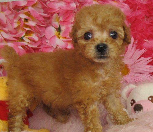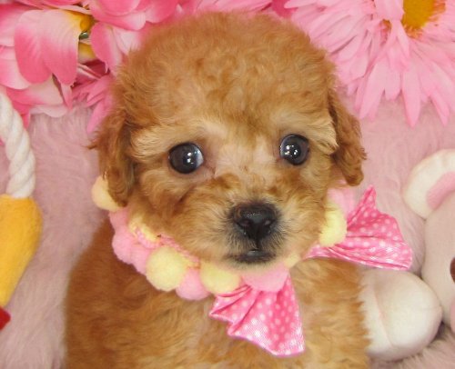 | コメント | アプリコット・お目メの大きな女の子です。 ふわふわのやわらかな毛質で、ナデナデしたくなります。 おとなしい性格で飼いやすい子犬です。 生後43日の体重は500グラム。 成犬時の予想体重は3キロ前後の女の子になります。 父親 : 1.8キロ レッド 母親 : 3キロ レッド 現在たくさん生まれて20匹ほどおりますので、ぜひぜひ見学においでください。 うちの子犬は全員トイレのしつけ済み。見学に来た人は「ちゃんとトイレでしてるーっ。おりこうだねー。」と皆さん感心していらっしゃいます。 もちろんこの子たちもできています。 ペットショップなどで見かける、ウンチの上で平気で寝ているような子犬を飼うと、おうちでのトイレのしつけはかなり難しくなります。 犬は心のパートナー。 「吠えない、噛まない、かじらない。」は室内犬として絶対条件です。 先日「別のペットショップでトイプードル飼って1ヶ月。」 という奥様が飛び込みで来られましたが、「家中のものを噛んでソファーもテーブルの足もじゅうたんも、みんなボロボロにされて、最近は(奥様の)手も噛むようになってきて、怖くなってきた。」とたいへんお困りの相談に来られました。 その場でしつけ方のお話をさせていただきまして、5日後には子犬を連れてきて「やっと抱っこして出られるようになって、家の中でもいい子になりました。」とお礼に来られました。 子犬の性格にもよりますが、このような暴れん坊になってしまうこともあります。 絶対にこのような暴れん坊の犬に育ててはいけません。 家庭や一般社会の中でみなさんにほめられる、すばらしい犬。 最高にマナーの良い犬に育てられるよう、1時間ぐらいしつけのお話をさせていただきます。 犬の気持ちや本能が理解できて、必ずいい子に育てられます。 ご家族全員でおいでください。 茨城県龍ヶ崎市。高速を降りたらどこも曲がらず一直線に8~9キロです。 東京から1時間ちょっと。4車線の大通りに面しているのでカーナビ一発で来ます。 電車の場合は決まらなくても駅まで必ず送迎しますのでご連絡ください。 「見学ご希望があっても、別の方からご予約金の振込みなどがあった場合は、そちらに決まってしまう場合があります。 あらかじめご了承ください。」 |
