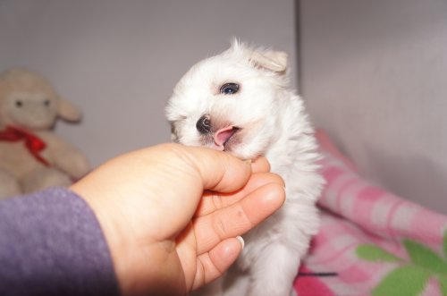 元気でよく食べよく遊ぶ、可愛い子です。ゲージに入れるとしばらく鳴いていますが、すぐ諦めて寝る本当に良い子です。 ブリーダーさんはメールの返信が少し遅いですが、質問したことには 親切に答えてくださるので聞くことを迷うことはありません。心強いです。(大阪府 女性)