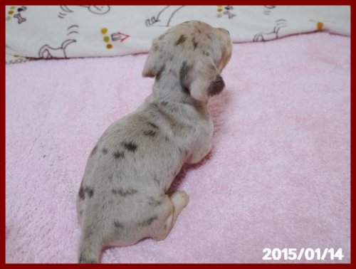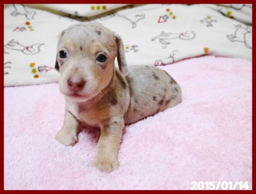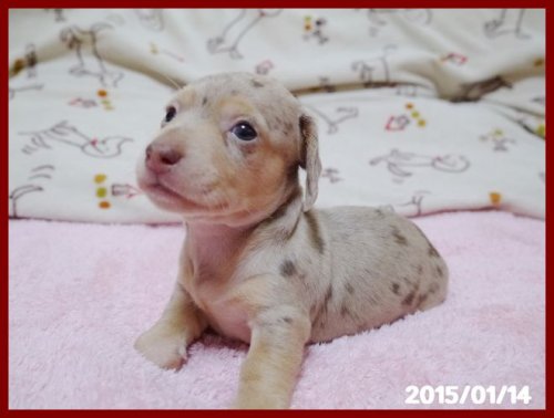 | コメント | 希少な毛色のカニンヘンスムースダックス君です。 パパはインターナショナルチャンピオン&JKCチャンピオンで、2年連続ぺディグリーアワード受賞犬のプレスト君(シルバーダップル)。 ママはJCKチャンピオンのエヴァちゃん(チョコレート&タン)。 両親共にチャンピオン同士の素晴らしい血統のカニンヘンダックスです。 淡いチョコレート色とベージュのような毛色のダップル柄です。 目は暗色ですので、色素の心配はありません。 とても良い子でムチムチと健康的に育っています。 お迎えいただけるのはワクチン接種と健康診断を実施後で、2月14日頃を予定しています。 事前のご予約やご見学もしていただけますので、お問い合わせをお待ちしております。 |