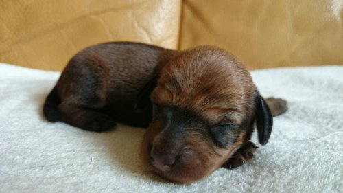 インターネットで犬を買うということに抵抗があったのですが、質問にも迅速に対応していただき、写真を送っていただいたり電話で話をして安心して子犬を迎えることができました。北海道から福岡と長距離だったのですが、家に着いた途端先住犬の2匹のダックスと元気に走り回ってました。とっても元気で愛嬌のあるかわいい子を迎えることができてとても嬉しいです。家に来てからもブリーダーさんから連絡があったり相談にも乗ってもらってます。本当にいいブリーダーさん、かわいい子犬に出会えてよかったです。(福岡県 女性)