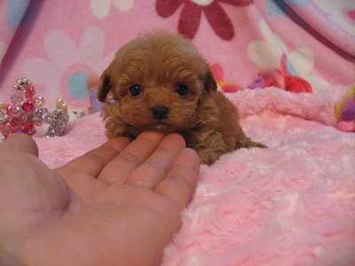 | コメント | お目目が大きくて小ぶりな子です お父さん・・・プードル レッド お母さん・・・チワワ ブラックタン お目目ぱっちりとっても 美人さんです 毛質はプードルに近い感じで お顔立ちはチワワに近い感じで 良い所をもらっている様です お鼻が短く幼いお顔だちです 胸に少しある白い毛がポイントです 大人になって2㎏位の可愛いサイズの 仕上がり予想です |