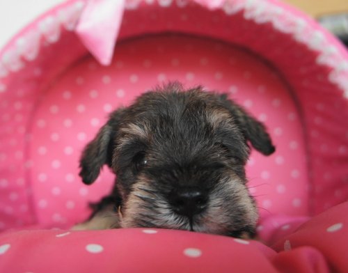 見学の申し込みからの対応も凄く良くて、当日の応対も非常に親切に的確に対応して貰えました。その場で直ぐにこの真摯な対応ができる人が繁殖させたワンコなら心配ないと思ったので内金を払い2週間後の昨日ワンコを引き取ることに致しました。ワンコを連れて新幹線に乗るのは初めてだったのでどんなもキャリーケースを用意して良いのか判らなかったので、準備をお願いしておいたところちゃんとした物を用意しておいてくれました。書類の説明や今後の飼い方その他に付いても質問にも丁寧に受け答えをしてくれて有難かったです。引渡し前にちゃんとシャンプーもされていたらしく良い匂いでした。この子でシュナウザーは4頭目ですが、今までにはこれほど手厚い対応をして貰ったのは初めてです。有り難うございました。(東京都 男性)