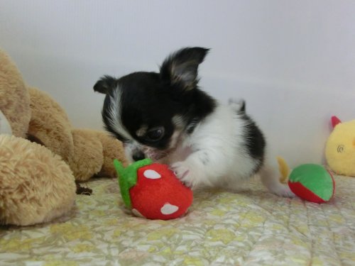 | コメント | 両親ともにロングのブラックタン&ホワイト 小ぶりで穏やかなママと、ドワーフタイプで人懐っこいパパのいいとこ取りで生まれた男の子です。 クリクリした大きな目とまん丸アップルヘッド、フレーズも綺麗に入ったスペシャルな子です。 毎日兄妹やママとじゃれ合いながら社会勉強をしています。 離乳食も順調に進んでいます。 お迎えまでにはトイレトレーニングも頑張ります! お写真では可愛さが伝わりきれません。 是非、ご見学にお越しください。 |