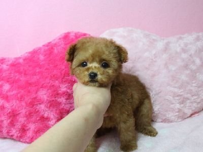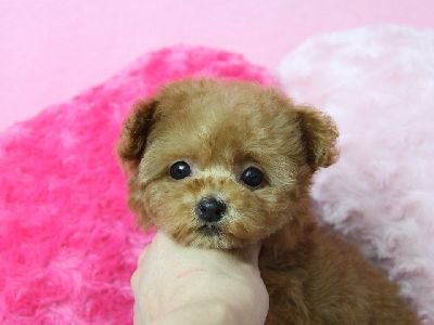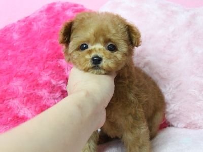 | コメント | 5月26日撮影 アプリコットに近いレッドです。 まんまるなお顔がとっても可愛いですよ♪ 性格は人なつこい明るいタイプです! 5月26日現在 生後61日で体重590gです。 成犬時予想体重は~2.5kg前後のタイニーサイズ予想です。 父 1.7kg 母2.4kg 1回目のワクチンは接種済みです。 |