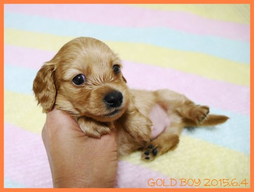 | コメント | 両親共にチャンピオン。 ママは今回初産で体重2.5キロのとっても小さい女の子です。 超優秀血統のカニンヘンロングダックスです。 ゴールドの男の子、 ピュアクリームの男の子、 ブラックタンの女の子の3頭です。 PRAが発症する心配もありません。 お迎えいただけるのは7月5日~7月14日頃となります。 見学やお問い合わせをお待ちしております。 ドッグショーに興味のある方へも家族の一員としてお迎えしたい方へもおすすめです。 |