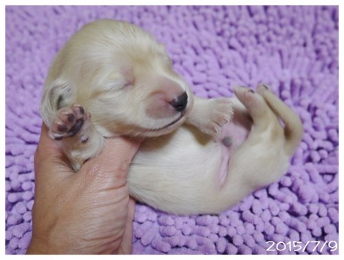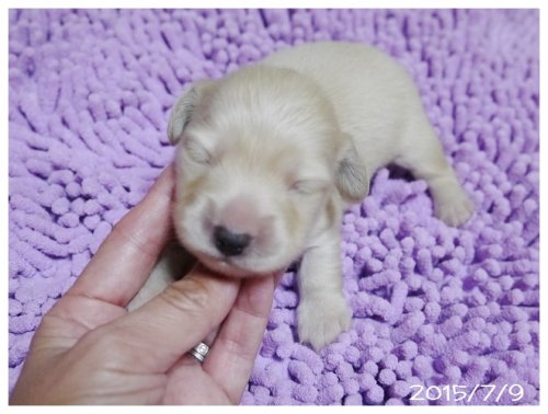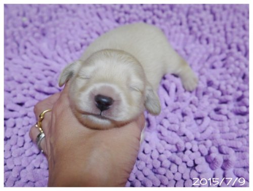 | コメント | パパもママもJKCチャンピオン同士という素晴らしい血統の子犬ちゃんです。 とってもきれいなピュアクリームで、お鼻や足の裏の色素もしっかりとしていて真っ黒です。 ダックスに発症が多いとされるPRA(進行性網膜委縮症)の検査もしておりますので、子犬ちゃんが将来PRAを発症する心配はありませんので、安心してお飼いいただけます。 順調にすくすくと育っています。 前回生まれた子犬ちゃんは現在ドッグショーチャレンジ中です。 犬質が高く、サイズも適正で、性格の良い素晴らしい両親から生まれたサラブレッドの子犬ちゃんですので、ぜひ良いご縁があってくれたらと思います。 ご予約やご見学のお問い合わせをお待ちしております。 お引き渡し出来るのはワクチン接種と健康診断を実施後で、8月末頃となります。 |