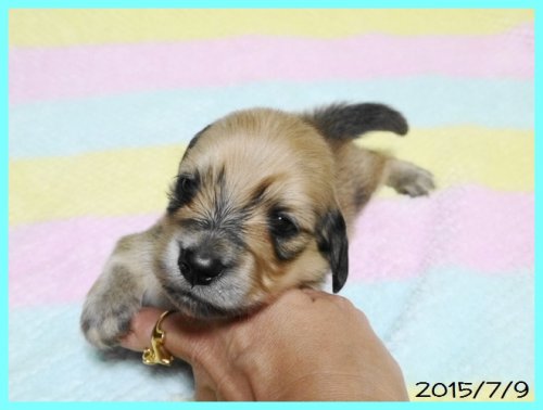 | コメント | パパはJKCチャンピオン、ママはJKCチャンピオン直娘という素晴らしい血統の子犬ちゃんです。 ダックスに多いとされているPRA(進行性網膜委縮症)の検査もしておりますので、子犬ちゃんが将来PRAを発症するリスクはありませんので、ご安心ください。 健康でとてもかわいい子犬ちゃんです。 お迎えいただけるのはワクチン接種と健康診断を実施後で、8月中旬頃となります。 ご予約やご見学のお問い合わせをお待ちしております。 シェーデットクリームは最初は黒っぽいですが、成長と共に黒い毛が少なくなっていって、将来的にはきれいなクリーム色に仕上がります。 素敵なご縁がありますように・・・・ |