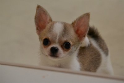 | コメント | 骨格構成のとってもキレイな四肢のしっかりした男の子です。 スムースコートはコートが短いので体のラインが丸見えです。 この子は前足、背線はまっすぐ、体型もスクエア、尾付きもよく、申し分のない体型の子です。 骨格構成がキレイな子は連れて歩いていても見栄えがします。 ワンランク上のチワワくんです。 毛色も白地に薄いベージュの毛色です。 今現在はベージュの中に黒い毛が混ざっていますのでパッとしませんが、成長と共に黒い毛が抜けて薄いベージュへと変化していきます。 現在お目々の周りから毛色が変わりつつあります。 生後5ヶ月頃には毛色が一段明るくなっていることと思います。 性格も明るくて人懐っこい尻尾フリフリです。 ママ以外の犬達にも積極的にあいさつができる社交的な子です。 サイズはとってもコンパクトで、成犬時1.6~1.8kgぐらいの予想です。 小さいですが、ご飯もよく食べてくれるので安心なタイプの子です。 パパはチャンピオン、ママもチャンピオン娘で代々アメリカ、カナダ、JKCチャンピオン多数のショーラインの血統です。 法律で対面販売が義務付けられましたので、当方までお越しいただける方か、東京まででしたら連れて行くことも可能です。 (お連れする場合は冷やかしを防ぐため、お迎えの有無に関わらず往復交通諸経費のご負担をお願いします。) お問い合わせはお気軽にどうぞ。 ワクチン接種も済んでいますので気に入っていただければそのまま連れて帰れます。 是非ご見学にいらしてくださいね。 |