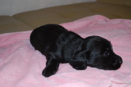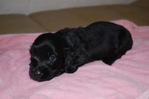 | コメント | 愛嬌たっぷりのミニチュア・ダックスフンド 真っ黒けの男の子 9月5日現在体重 740g 楽しい家族になりますよ。 お引渡しは9月下旬になりますがご予約承ります。 |