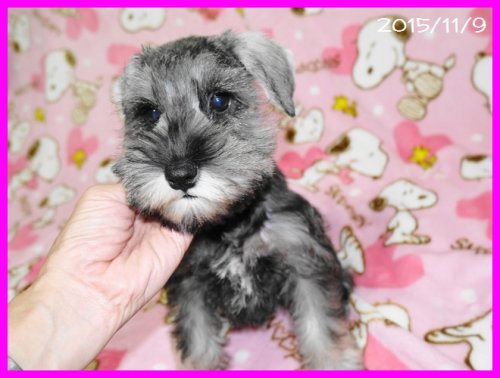 | コメント | パパはアメリカチャンピオン&インターナショナルチャンピオン&JKCチャンピオン直子のキルト君(ソルト&ペッパー) ママはJKCチャンピオン孫のアフロちゃん(ソルト&ペッパー) 両親の素晴らしい血統を受け継いでとてもかわいらしい子犬ちゃんが生まれました。 ソルト&ペッパーの男の子が1頭と女の子が1頭、ブラック&シルバーの女の子が1頭の3頭兄妹ちゃんです。 すくすくと順調に育っています。 見学やご予約はいつでもお承ります。 10/13にトリミングしてとてもかわいらしく変身しました♪ ワクチン接種と健康診断も実施済みですので、すぐにでもお迎えいただけます。 トイレのしつけもほぼ完ぺきに出来ています。とっても人懐こくて愛らしい女の子です。 |