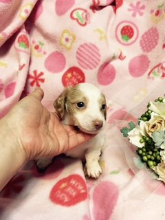 | コメント | 珍しいクリームパイボールドの可愛い赤ちゃん生まれました。 テッキング(点々)が、出にくいタイプになります。 小ぶりな母犬から生まれた、小ぶりな男の子です。 是非見学にいらしてご覧になってください。 写真よりずっとかわいい子です。 人と違った可愛いダックスをお探しの方に。 6種ワクチン接種済み、健康診断済みですのでいつでもお渡しできます。 ワクチン代、お届けにかかる費用は、別途お願いします。 お気軽にお問い合わせください。 |