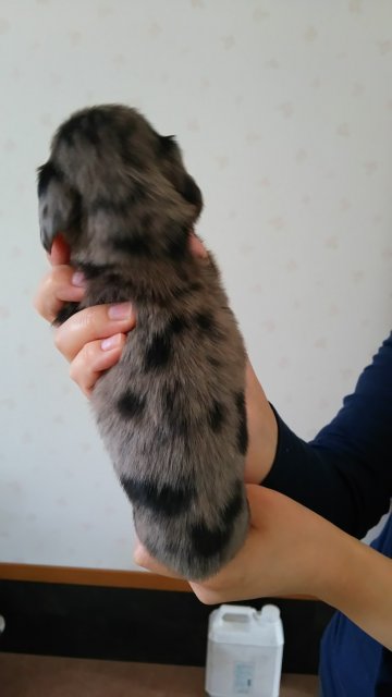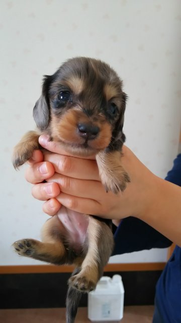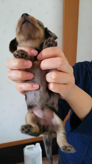 | コメント | 母、チョコダップル 父、ブラックタン この子は、姉妹の中でも一番小さい子です。 仔犬の代金に、予防接種は含みません。 |