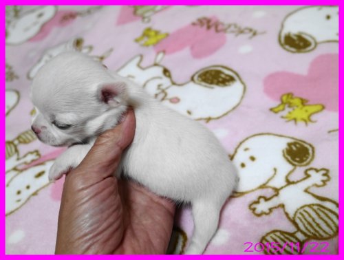 | コメント | パパはアメリカチャンピオン&カナダ&JKCチャンピオン直子の輝斗【ライト】君(ブラックタン&ホワイト) ママはアメリカチャンピオン孫のイソップちゃん(フォーン)です。 パパもママも小ぶりで2キロ弱の小さなチワワちゃんです。 子犬ちゃんはホワイトのスムースの女の子ちゃんです。 (ブラックタンホワイトの男の子と2頭兄妹です) 70グラムで生まれて、生後3週間(11月22日現在)で体重250グラムと極小サイズのちびちびちゃんですが、とっても元気でムチムチとしています。 色素もだんだんしっかりとしてきて、お鼻も黒くなってきました。 真っ白でつるつるのとってもかわいい女の子ちゃんです。 極小サイズなので、お迎えいただけるのは年明けの1月7日以降で双方の都合の良い日程が良いと思います。 見学もしていただけますので、ぜひお問い合わせをお待ちしております。 |