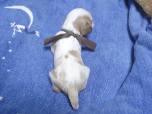 | コメント | お父さんがJKCチャンピオンの吉宗君、お母さんがJKCチャンピオン直子の小柄なハーモニーちゃんから生まれたダンディーな男の子です。(茶リボン君) チャンピオン直子 |