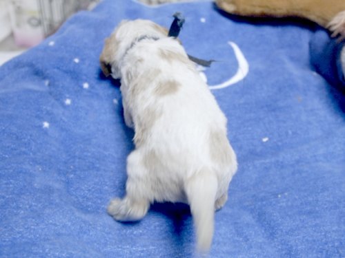 | コメント | お父さんがJKCチャンピオンの頼朝君、お母さんがJKCチャンピオン直子の小柄なマリアナちゃんから生まれたダンディーな男の子です。(紺色リボン君) チャンピオン直子 |