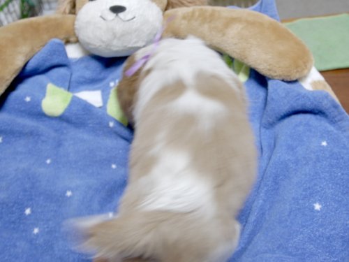 この度はとっても元気な子をありがとうございました。 見学の際は駅まで迎えにきていただき、説明もとても丁寧で安心しました。 空輸で送っていただき、ありがとうございました。 迎えてから一週間が経ち、家にも慣れて、へそ天で寝ています。 トイレトレーニングも、来た時から8割できていて、今ではほとんど失敗しなくなりました。 可愛く元気で、毎日元気に飛び跳ねています。(奈良県 女性)