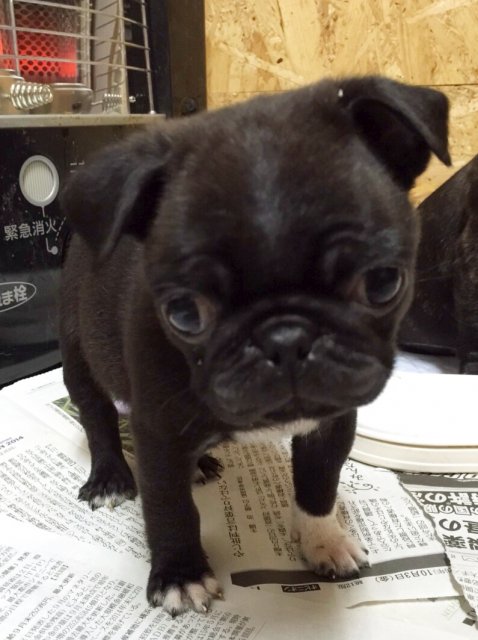 今日、黒パグ(雄)を見学に行きました。これまで、パグのフォーンとブラックを飼ってきましたが、どちらも雌でおとなしかったので、できれば雌がいいなという思いと、雄で大丈夫かなという不安があり、とりあえず見学のつもりで出かけました。見せて頂いた黒パグは表情豊かでとても可愛いく、本間さんとお話している間にすっかりなついてしまい、不安もなくなり購入を決めました。本間さんには、爪の切り方や耳そうじの仕方、歯磨きやえさの与え方、しつけまで丁寧に教えて頂きました。これまでは忙しくてきちんとしつけができなかったので、とても参考になりました。そのまま連れて帰りましたが、夜帰宅した夫も息子も新しい家族をみてとても喜んでいました。本間さん、本当にありがとうございました。(栃木県 女性)