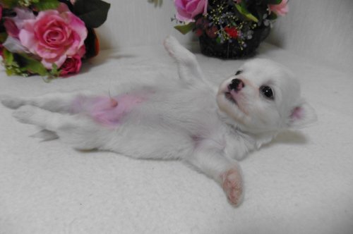| コメント | 3月6日午後8時33分に90gで誕生しました。 今日まで大変元気に育って来ました。 4/5 体重は558gになりました。 一日のほとんどの時間を眠っていますが、食欲が有り、毎日楽しそ うに遊んで過ごしています。 性格は陽気で好奇心が旺盛で楽しい子のようです。 犬種図鑑には仲間や家族にはとても愛情深く見知らぬ人に対しては 内気、家族の長になるのを好むが一度順応すると他の者を大目にみ る。好奇心旺盛だが気まぐれで神経質になりがちな面が有ります。 機敏で清潔好きな犬であると記されています。 飼い方にもよりますしすべての子にあてはまるとも思えませんが間違 ってはいないと思います。 同じく犬種図鑑には泉門の有る子もいます眼と眼の間は離れている と記されていてアップルドーム頭蓋の多くの子はモレラが有ります。 この子も小さい泉門が有ります。 毛色はホワイトで申請させていただきました。 今はお耳が少し寝ていますがピンと立ちますので安心して下さい。 お鼻も黒くなりますよ。 父の毛色はフォーン&ホワイトで可愛い子です 今は太っていて体重は2、8㎏前後です。 母の毛色はチョコレート&クリーム、性格の優しい子で、体重 は3,3㎏前後です。 この子の成犬時は2,8㎏前後でしょうか。 幼いので撮影では緊張していますが普段はもっと愛嬌が有って可愛い いですよ。 *お願いです。 ご見学にお越しの際は感染予防の為に他のブリーダーさま ペットショップさまへはお立ち寄りにならないように、ま た知らないわんちゃんを触ってお越しにならないようにお 願いいたします。 *直接見に来られて購入される事を希望しますが、遠方の方 又事情で来られない方へ写真、動画等を送らせて頂きます。 詳細な情報を正直にお伝えしたいと思いますのでお気軽にご 連絡下さい。 *法律が対面販売となりましたので一度でも見学のお越しを お願いいたします。 *遠方の方でも交通費をご負担いただきましたら、スタッフ が, お近くまでお届けに伺います。ご相談下さい。 |