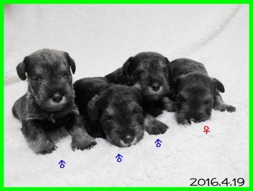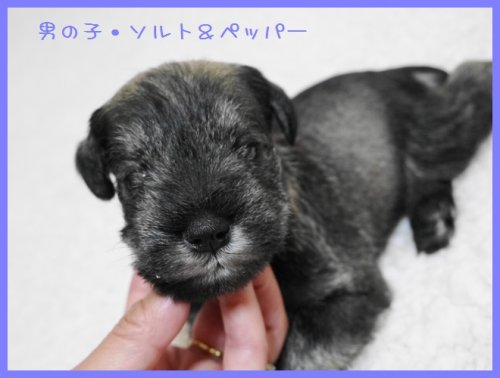 | コメント | パパはアメリカチャンピオン&インターナショナルチャンピオン&JKCチャンピオン直子のキルト君(ソルト&ペッパー)。 ママはJKCチャンピオン直娘のアフロちゃん(ソルト&ペッパー) 子犬は男の子3頭と女の子1頭の4頭兄妹で生まれました。 明るい毛色のソルト&ペッパーの男の子1頭と、かなり黒い感じで一見ブラック&シルバーのようにも見えるソルト&ペッパーが3頭です。 すくすくと順調に育っております。 お引き渡し可能になるのはワクチンと健康診断を実施後で5月中旬以降双方の都合の良い日程となります。 ご質問やご見学を承りますので、ご連絡をお待ちしております。 |