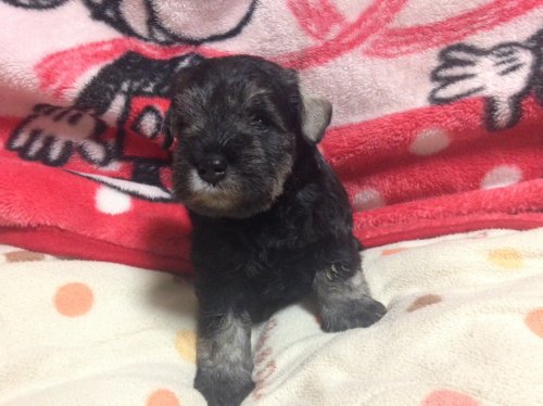 以前 2匹のわんこと暮らしていましたが立て続けに亡くしてしまい立ち直れずにいたのですが、もう一度わんことの生活を望み次に一緒に暮らす子もミニシュナと考えだした時に福井さんの仔犬に目が留まりました。 急な見学希望にも気持ちよく応じていただきました。お会いするまでに福井さんのミニチュアシュナウザー達を見ていて、かっこいいなぁと思っていました。仔犬が気に入ったのはもちろんですが決め手は福井さんとの会話で感じた人柄です。 本当に犬が好き、ミニシュナが大好きなんだなと感じました。 約20後の受渡日には 随分成長した仔犬をみて感激しました。 我が家に着いてすぐにトイレでおしっこをするとその後はうんちもも失敗せずにできています。急な環境の変化なのに鳴き続けることもなくゲージ内で機嫌よく遊んでいます。 可愛くて元気いっぱいの仔犬を譲って頂いた福井さんに感謝しています。(兵庫県 女性)