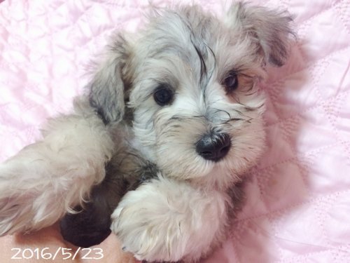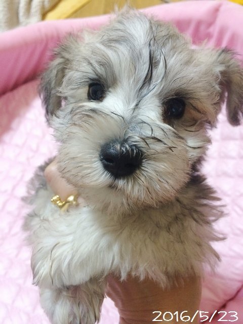 | コメント | ミニチュアシュナウザーではとても珍しい毛色です。 今は黒っぽい刺し毛がありますが、成長と共に薄くなっていって将来的には白またはクリーム色に少し刺し毛が残る程度になると思います。 小ぶりなサイズで、お目目がとっても印象的なぼくちゃんです。 まつ毛が長くてとっても癒し系のかわいい子なので、ぜひ会いにいらしてください。 |