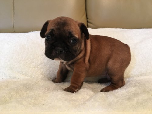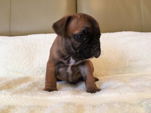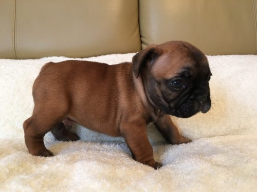 | コメント | お父さん犬ブリンドル お母さん犬クリームの両親から4月30日に元気に産まれました。フォーン&ブラックマスクの珍しい毛色で、お顔の可愛い男の子です。 離乳食も沢山食べ、ムチムチ元気に育っています。 ご見学お待ちしています。 北関東自動車道の宇都宮上三川インターを降り小山方面に向かい7〜8分のわかりやすい場所です。 |