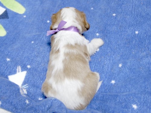 | コメント | お父さんがJKCチャンピオンの頼朝君、お母さん小柄なチャンピオン直子のサブリナちゃんから生まれたキュートな女の子です。(紫リボンちゃん) チャンピオン直子 |