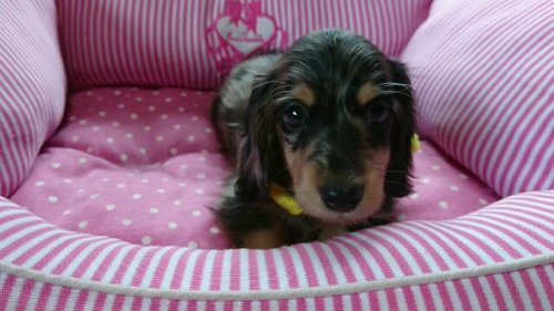 | コメント | 父 カニンヘンダックス ブラックタン 母 ミニチュアダックス シルバーダップル 優しい両親からとっても可愛い5姉妹が誕生しました! 8/27 初回ワクチン接種・健康診断済み (ワクチン証明書・健康診断書お渡し致します) 8/27 現在の体重・・・1.20㎏ とっても人懐こい女の子 離乳食も良く食べスクスク成長中 土曜・日曜・祭日のご見学大歓迎です。 自宅リビングにてのご対応となりますので、事前にご予約をお願い致します。 |
