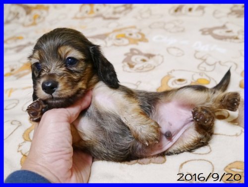 亡くなった愛犬達と同じ、 ワイヤーダックスの子犬を探していましたが、珍しい犬種という事もあり、 なかなか出会えませんでした。 諦めかけた頃、こちらのサイトで可愛い子犬を見つけ、思いきってメールをさせて頂きました。 遠藤ブリーダー様の迅速丁寧な対応で、 お陰様で無事に子犬を迎える事が出来ました。 本当にありがとうございました。 ブリーダーズ様にも感謝致します。 (北海道 女性)