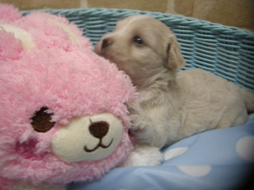 この度は可愛いカニンヘンダックスの女の子を譲っていただきありがとうございます。濱田さんのところからのお迎えは2頭目で、可愛さは初めの子でわかりすぎるほどわかっていたので絶対可愛くなること間違いなしで決めさせていただきました。 どんなことでも相談してくださいねと言う心強い言葉や、可愛い動画を送っていただいたりと本当によくしていただけました。 ワンちゃんは初日からアイコンタクトばっちり、よく食べ、よく寝て、元気いっぱいです。 家にきて1週間、先住犬と遊びながら元気に成長中です。 またよろしくお願いします。(大阪府 女性)