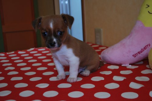 | コメント | ジャックラッセル・テリアのママとチワワのパパから誕生した 「チワジャック」です。 成犬時もジャックラッセル・テリアほど大きくならないと思います。 足も短くめちゃくちゃかわいい子です! 9月29日現在体重 800g ワクチン1回分込の価格です。 お引渡しは10月中旬頃になりますがご予約承ります。 |