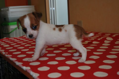 | コメント | ジャックラッセル・テリアのママとチワワのパパから誕生した 「チワジャック」です。 成犬時もジャックラッセル・テリアほど大きくならないと思います。 全体的にはジャックラッセル・テリア風ですが顔つきがややチワワ風です。 10月2日現在体重 600g ワクチン1回分込の価格です。 お引渡しは10月中旬頃になりますがご予約承ります。 |