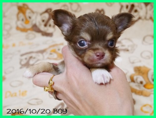 | コメント | パパはJKCチャンピオン直子の北斗君。 ママはJKCチャンピオン直娘のアンバーちゃん。 両親共にJKCチャンピオン直子で小ぶりなとてもかわいらしいチワワちゃんです。 将来的な大きさはだいたい2キロくらいのコンパクトなサイズに収まると思います。 生後1か月時の体重は320グラムほどです。 明るく人懐こい性格でとても愛らしい子ですので、ぜひ見学にいらしてください。 お引き渡しできるのはワクチン接種と健康診断を実施後で11月18日頃となります。 お問い合わせやご予約のご連絡をお待ちしております。 素敵なご縁がありますように、、、、、。 |