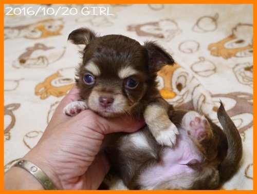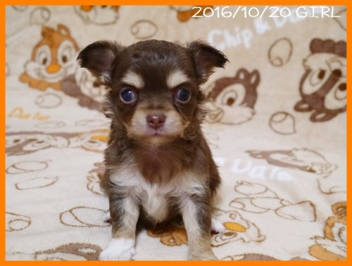 | コメント | パパはJKCチャンピオン直子の北斗君。 ママはJKCチャンピオン直娘のアンバーちゃん。 両親共にJKCチャンピオン直子で小ぶりなとてもかわいらしいチワワちゃんです。 将来的な大きさはだいたい2キロくらいのコンパクトなサイズに収まると思います。 生後1か月時の体重は320グラムです。 明るく人懐こい性格でとても愛らしい子ですので、ぜひ見学にいらしてください。 お引き渡しできるのはワクチン接種と健康診断を実施後で11月18日頃となります。 お問い合わせやご予約のご連絡をお待ちしております。 素敵なご縁がありますように、、、、、。 |