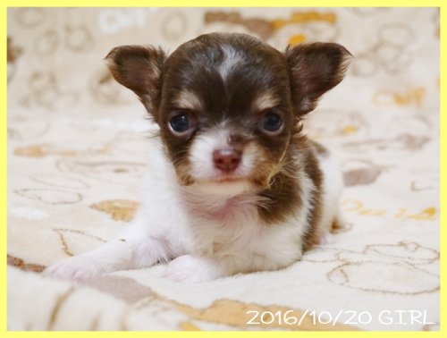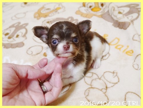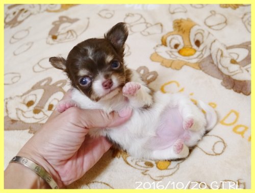 | コメント | パパはJKCチャンピオン直子の北斗君。 ママはJKCチャンピオン直娘のアンバーちゃん。 両親共にJKCチャンピオン直子で小ぶりなとてもかわいらしいチワワちゃんです。 将来的な大きさはだいたい2キロ弱のコンパクトなサイズに収まると思います。 生後1か月時の体重は300グラム弱のとても小さな女の子です。 残留を検討していましたが出産には小さすぎると思いますので、一般家庭の方に大切にかわいがっていただきたいと思って募集をする事に致しました。 明るく人懐こい性格でとても愛らしい子ですので、ぜひ見学にいらしてください。 お引き渡しできるのはワクチン接種と健康診断を実施後で11月18日頃となります。 お問い合わせやご予約のご連絡をお待ちしております。 素敵なご縁がありますように、、、、、。 |