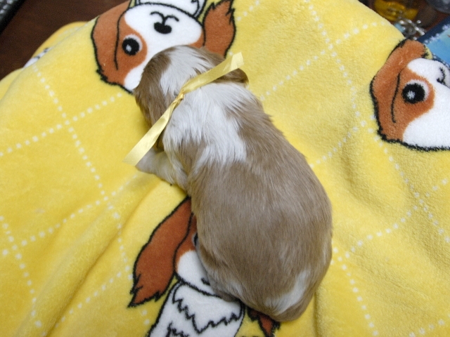 | コメント | お父さんがJKCチャンピオンの吉宗君、お母さん小柄なチャンピオン直子のシンシアちゃんから生まれたキュートな女の子です。(黄リボンちゃん) チャンピオン直子 |