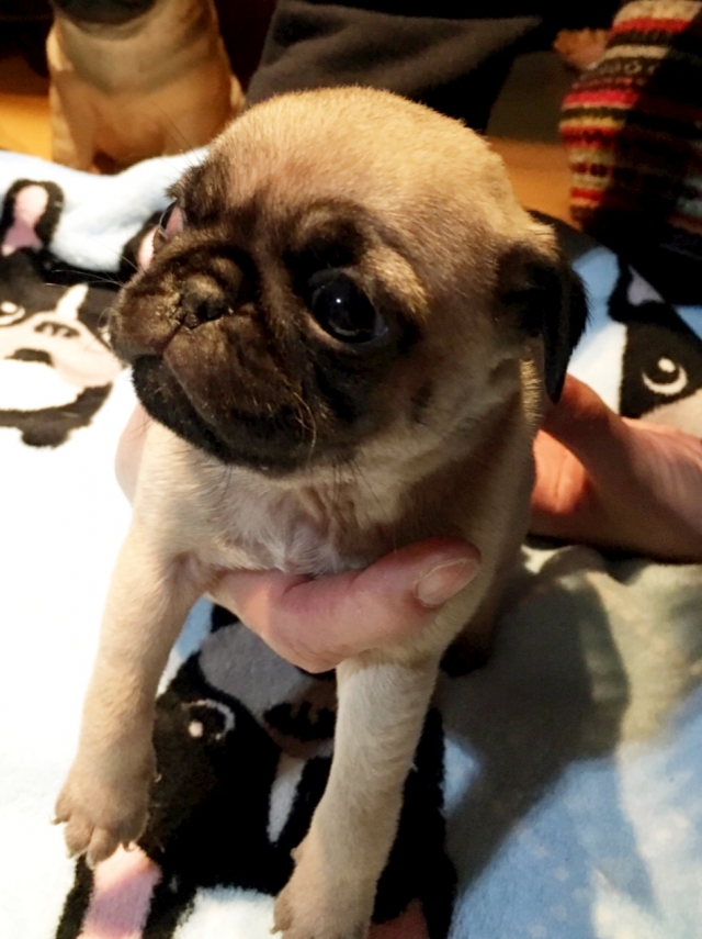 今日、黒パグ(雄)を見学に行きました。これまで、パグのフォーンとブラックを飼ってきましたが、どちらも雌でおとなしかったので、できれば雌がいいなという思いと、雄で大丈夫かなという不安があり、とりあえず見学のつもりで出かけました。見せて頂いた黒パグは表情豊かでとても可愛いく、本間さんとお話している間にすっかりなついてしまい、不安もなくなり購入を決めました。本間さんには、爪の切り方や耳そうじの仕方、歯磨きやえさの与え方、しつけまで丁寧に教えて頂きました。これまでは忙しくてきちんとしつけができなかったので、とても参考になりました。そのまま連れて帰りましたが、夜帰宅した夫も息子も新しい家族をみてとても喜んでいました。本間さん、本当にありがとうございました。(栃木県 女性)