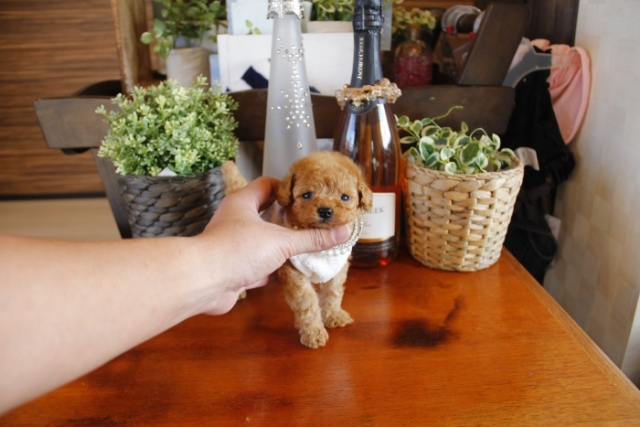 | コメント | 父1,4キロ 母2.3キロ 今人気のアプリコット 退色してもさらに黄金色の輝きを放ち続けるのが 人気のわけです 性格も穏やかで人懐こい遊びが大好きな子です 早めにお問い合わせくださいね すでにトイレのしつけは完了しております(*´ω`*) ペットショップやオークション出しのブリーダーと違い欧米のブリーディング同様、親や兄弟と社会期を過ごさせることで 人間と暮らした時にスムーズに暮らせるようにしております。 親犬達も家族として朝7時からドックランで遊び、全室冷暖房完備の部屋で過ごし、専門のスタッフや専門学校の方々と協力し合いながら 衛生管理に努めております。 犬舎の特徴としましては、東京や神奈川近郊の為マンションのお客様が8割を占めます。その為小さな1キロから2.8キロまでに収まるように、 母犬を2.8キロまでと決めてブリーディングをしている為、後で極端に大きくなる子はいません。 瞳の丸く大きなところやマズル(鼻先)が短いもの特徴で、父犬、母犬、全て私が全国の可愛いトイプードルを一頭、一頭厳選して親犬としてブリーディングした子犬のみを掲載しております。 こだわりとしては、お客様がお迎えされた後、その子がTV出演、雑誌やカレンダーのモデルとして活躍の場が増え我が家を忘れないでいてもらいたい為、 本気でこだわりを持って常にトイプードルを飼うなら此処だと皆様全員に思われる犬舎でありたいと思います。 ありがたいことに今では、雑誌やTV出演、カレンダーなど多くの出身トイプードルちゃんたちが可愛く撮影されお客様からも喜びの声を頂いております。 我が家は35頭の小さな犬舎ではありますが、頭数が多いところでは管理が行き届かない、PRA若年性白内障などの遺伝性疾患の発症がないように努めております |