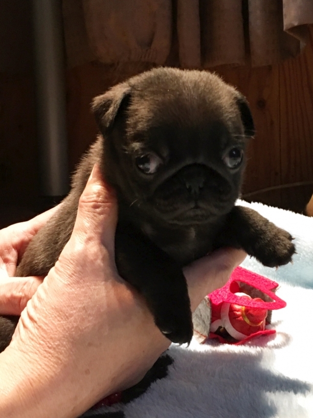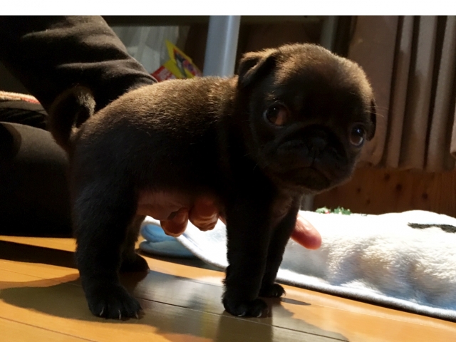 今日、黒パグ(雄)を見学に行きました。これまで、パグのフォーンとブラックを飼ってきましたが、どちらも雌でおとなしかったので、できれば雌がいいなという思いと、雄で大丈夫かなという不安があり、とりあえず見学のつもりで出かけました。見せて頂いた黒パグは表情豊かでとても可愛いく、本間さんとお話している間にすっかりなついてしまい、不安もなくなり購入を決めました。本間さんには、爪の切り方や耳そうじの仕方、歯磨きやえさの与え方、しつけまで丁寧に教えて頂きました。これまでは忙しくてきちんとしつけができなかったので、とても参考になりました。そのまま連れて帰りましたが、夜帰宅した夫も息子も新しい家族をみてとても喜んでいました。本間さん、本当にありがとうございました。(栃木県 女性)