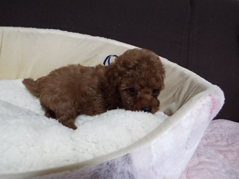 藤澤さんからトイプードルの男の子を譲って頂きました。写真を見て一目惚れし、見学日に契約させて頂き、一緒にお家に帰ってきました。奥さんが対応して下さったのですが、とても親切な方でワンちゃん達への愛情が溢れていました。藤澤さんのお家で育てられたからこその愛嬌と元気溢れるワンちゃん達に本当に驚きました。初めて室内犬を飼う私達にもとても分かりやすく説明をして下さり本当に感謝しています。自宅に連れて帰って来てからも親切に連絡を下さり、出逢えて良かったと心から思っています。(兵庫県 女性)