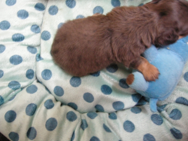 この度は可愛いカニンヘンダックスの女の子を譲っていただきありがとうございます。濱田さんのところからのお迎えは2頭目で、可愛さは初めの子でわかりすぎるほどわかっていたので絶対可愛くなること間違いなしで決めさせていただきました。 どんなことでも相談してくださいねと言う心強い言葉や、可愛い動画を送っていただいたりと本当によくしていただけました。 ワンちゃんは初日からアイコンタクトばっちり、よく食べ、よく寝て、元気いっぱいです。 家にきて1週間、先住犬と遊びながら元気に成長中です。 またよろしくお願いします。(大阪府 女性)