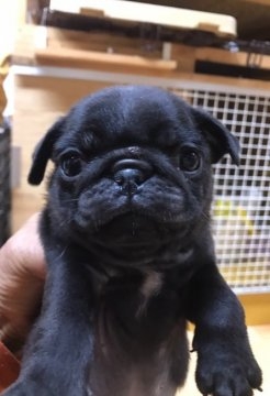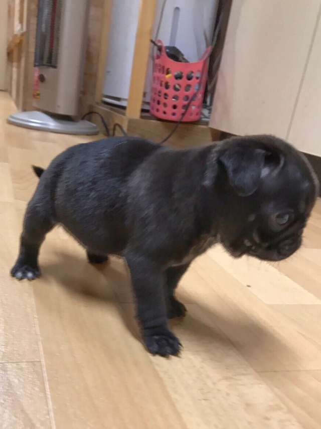 今日、黒パグ(雄)を見学に行きました。これまで、パグのフォーンとブラックを飼ってきましたが、どちらも雌でおとなしかったので、できれば雌がいいなという思いと、雄で大丈夫かなという不安があり、とりあえず見学のつもりで出かけました。見せて頂いた黒パグは表情豊かでとても可愛いく、本間さんとお話している間にすっかりなついてしまい、不安もなくなり購入を決めました。本間さんには、爪の切り方や耳そうじの仕方、歯磨きやえさの与え方、しつけまで丁寧に教えて頂きました。これまでは忙しくてきちんとしつけができなかったので、とても参考になりました。そのまま連れて帰りましたが、夜帰宅した夫も息子も新しい家族をみてとても喜んでいました。本間さん、本当にありがとうございました。(栃木県 女性)