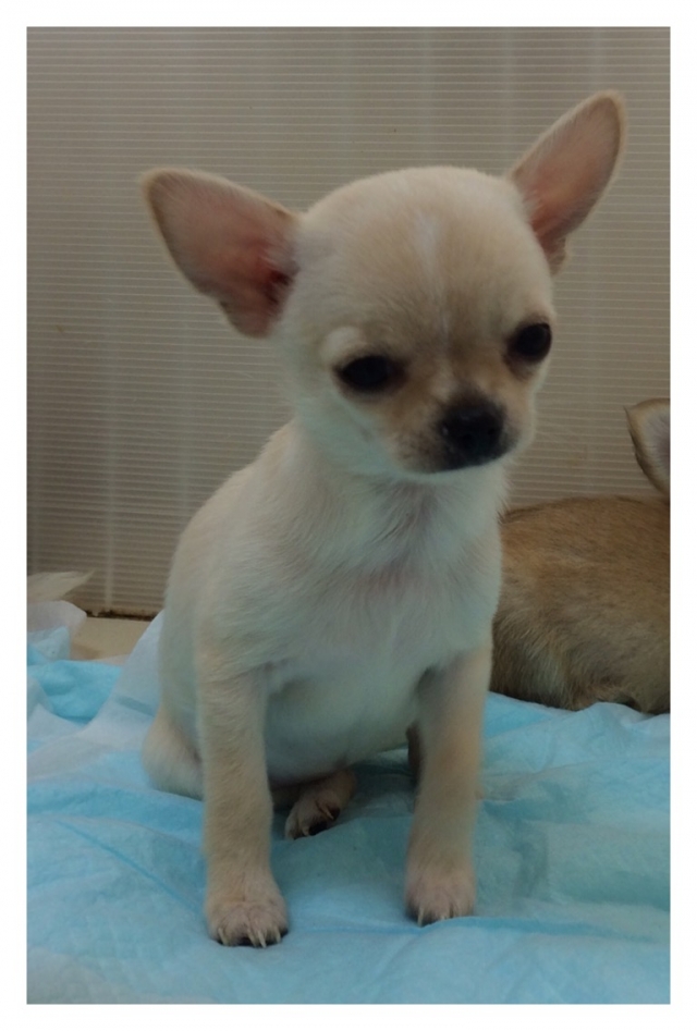 | コメント | とっても可愛いスムースの女の子です。 ママそっくりに成長中~♪ この子は写真写りこそ悪いですが、短いお鼻とどんぐりお目々でとっても可愛いお顔をしております。 今でこそどんぐりお目々のママですが、ベビーの頃はこの子のような感じでした 笑 将来はちょっと見かけないぐらい美人さんに成長するはずです。 頭部の張りはまだ仔犬ですのでこの程度ですが、成長と共にどんどんキレイなアップルヘッドになっていきます。 お顔、犬質共に良い子です。 また性格はとっても明るくて人懐っこいいつもルンルンなお得な性格 笑 お顔、犬質、性格共にスペシャルクラス♪ 現時点で見当たる欠点もありません。 成犬時の予想体重は1.8kg前後の予想です。 コンパクトサイズですが、ご飯もしっかりと食べてくれますので安心なタイプです。 当方では健康管理はもちろん仔犬に色々な事を体験させ社会性もつけながら飼育しております。 もちろん新しいお家に行ってもオーナー様が困らないようにトイレトレーニングもさせております。 また両親の性格も非常に気を遣っておりますので、どの親犬をご覧いただいても人懐っこく甘えん坊ですので、チワワのイメージが変わると思います。 また性格だけでなく、皆様が連れて歩いて自慢出来るような、チワワらしいチワワを繁殖出来るように親犬の犬質も厳選しております。 年末年始もご見学可能です。 まずはお気軽にお問い合わせください。 また法律で対面販売が決まっておりますので、当方までお越しいただける方のみお問い合わせくださいませ。 家族の一員として大切に飼育してくださる方とのご縁があると嬉しいです。 |