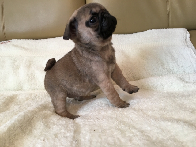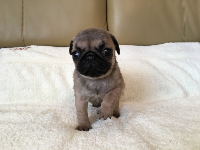 パグの飼育歴は30年以上になります。今年親の代から買っていた 黒パグを亡くしてから家を埋め尽くしているパググッズを見るたびに いつか新しい仔を迎えたいと思うようになりました。 北関東でブリーダーさんを探しているうちに木村様を知り、見学、購入の運びとなりました。 このたび性格も大変おおらかな素晴らしい仔犬をお譲りいただき大変感謝しております。 (茨城県 男性)