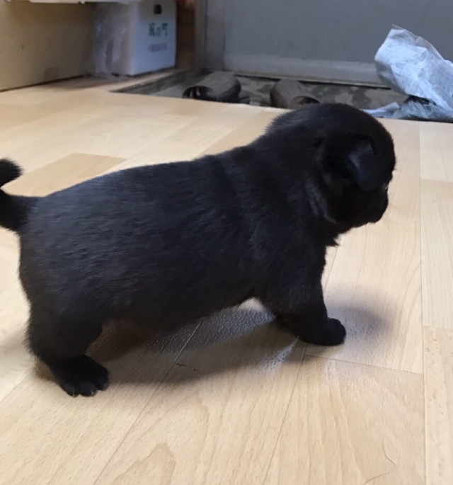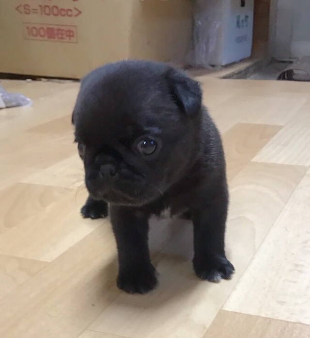 今日、黒パグ(雄)を見学に行きました。これまで、パグのフォーンとブラックを飼ってきましたが、どちらも雌でおとなしかったので、できれば雌がいいなという思いと、雄で大丈夫かなという不安があり、とりあえず見学のつもりで出かけました。見せて頂いた黒パグは表情豊かでとても可愛いく、本間さんとお話している間にすっかりなついてしまい、不安もなくなり購入を決めました。本間さんには、爪の切り方や耳そうじの仕方、歯磨きやえさの与え方、しつけまで丁寧に教えて頂きました。これまでは忙しくてきちんとしつけができなかったので、とても参考になりました。そのまま連れて帰りましたが、夜帰宅した夫も息子も新しい家族をみてとても喜んでいました。本間さん、本当にありがとうございました。(栃木県 女性)