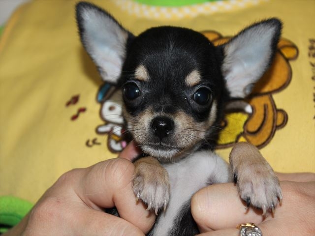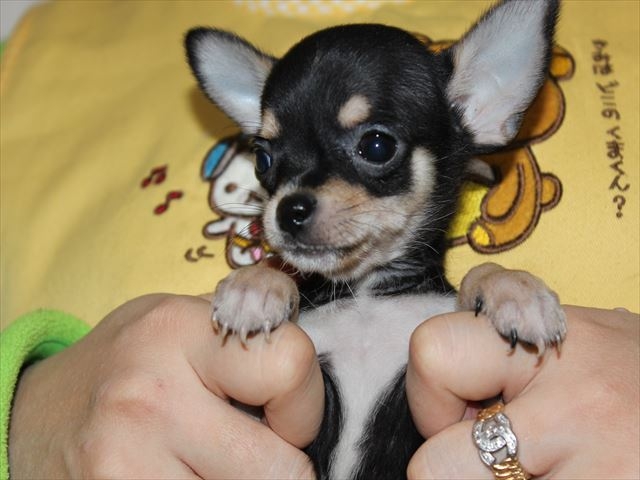 | コメント | 彼のパパはスマイル君! スマイル君のパパはブランバーズ犬舎ご愛用犬のイマジン君で 2010年度のワールドドッグショーでチワワ世界ナンバー1のタイトルを受賞! その後レベルの高い北米の数か国に渡り数々の高い賞歴と 評価を受けたスーパードッグです!! さらにその先祖も世界的に有名な犬舎出身で数々の世界的な評価を受けた 名犬の血を受け継いだ子ですのでこの子はいわば「チワワ界のサラブレッドです」 彼は最良血統を受け継いだだけのこともあり お顔もボディーもくちゅっとつんで骨量もしっかりあり 食欲も旺盛で元気に走りまわりすくすくと成長中です! 現在の体重は480gです! スムースマニアにはたまらないとっても素敵な ブラックタン&ホワイトの男の子です! ぜひ一度彼に会いにお越しにいらしてください^^ 御縁があった場合のお迎え方法は色々選択肢があり 関東方面のお客様であれば新幹線にて品川駅まで 九州方面のお客様であれば博多駅までお伺いさせていただいていますので 遠方の方も是非お問い合わせ下さいませ。 素敵な飼い主様のご家族の一員に迎え入れていただけることを この子とともに楽しみにお待ちしております。 宜しくお願い致します。 |