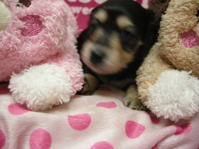 この度は可愛いカニンヘンダックスの女の子を譲っていただきありがとうございます。濱田さんのところからのお迎えは2頭目で、可愛さは初めの子でわかりすぎるほどわかっていたので絶対可愛くなること間違いなしで決めさせていただきました。 どんなことでも相談してくださいねと言う心強い言葉や、可愛い動画を送っていただいたりと本当によくしていただけました。 ワンちゃんは初日からアイコンタクトばっちり、よく食べ、よく寝て、元気いっぱいです。 家にきて1週間、先住犬と遊びながら元気に成長中です。 またよろしくお願いします。(大阪府 女性)