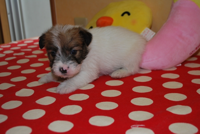 | コメント | 愛嬌たっぷりのジャックラッセル・テリア 楽しい家族になりますよ! 毛質はブロークン予想です。 1月12日現在体重 900g ワクチン1回分、血統書代込の価格です。 お引渡しは1月下旬頃になりますがご予約承ります。 |