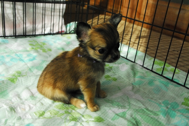 | コメント | 引渡しは、3月中旬以降の予定です。1回目のワクチン接種後となります。 (母犬、兄弟犬の中で犬としての社会化期間を十分に過ごした状態でお引き渡しを希望していますので、ご理解お願いします) 毛色はレッド系ですが黒色が入っています。成長と共に黒色は薄くなると思います。 2017年2月8日: 体重260g。まだ歩くことも出来ませんが、毎日おっぱいを飲んで順調に育っています。 2月17日: 体重357g。よちよち歩きを始めました。 1日2回ですが、離乳食を食べ始めました。まだ、おもちゃなどには関心を示しませんがあるき始めると興味を持つと思います。 光の加減で黒く見えたりしますが、成長と共に黒い毛色はもう少し薄くなると思います。 2月25日: 体重423g。離乳食になったので体重の増え方も早くなりました。歩きを始めました。 歯も生えは始め、ベットのあるサークル内では自由に歩き回り兄弟犬とじゃれ合っています。 周りの環境にも徐々に関心を示していますが、写真撮影の為にサークル外に出すとまだ少し緊張しているようです。それでも恐る恐る歩き始めています。 3月4日: 体重480g。 歯も生えて母犬と同じ餌を食べる様になりました。 元気に兄弟と遊びでいます。じっとしていないので撮影も大変。 色々な物に関心を示し、おもちゃで遊んだり呼ぶと膝の上に駆け上がってきます。 人が大好きな子になっています。 |